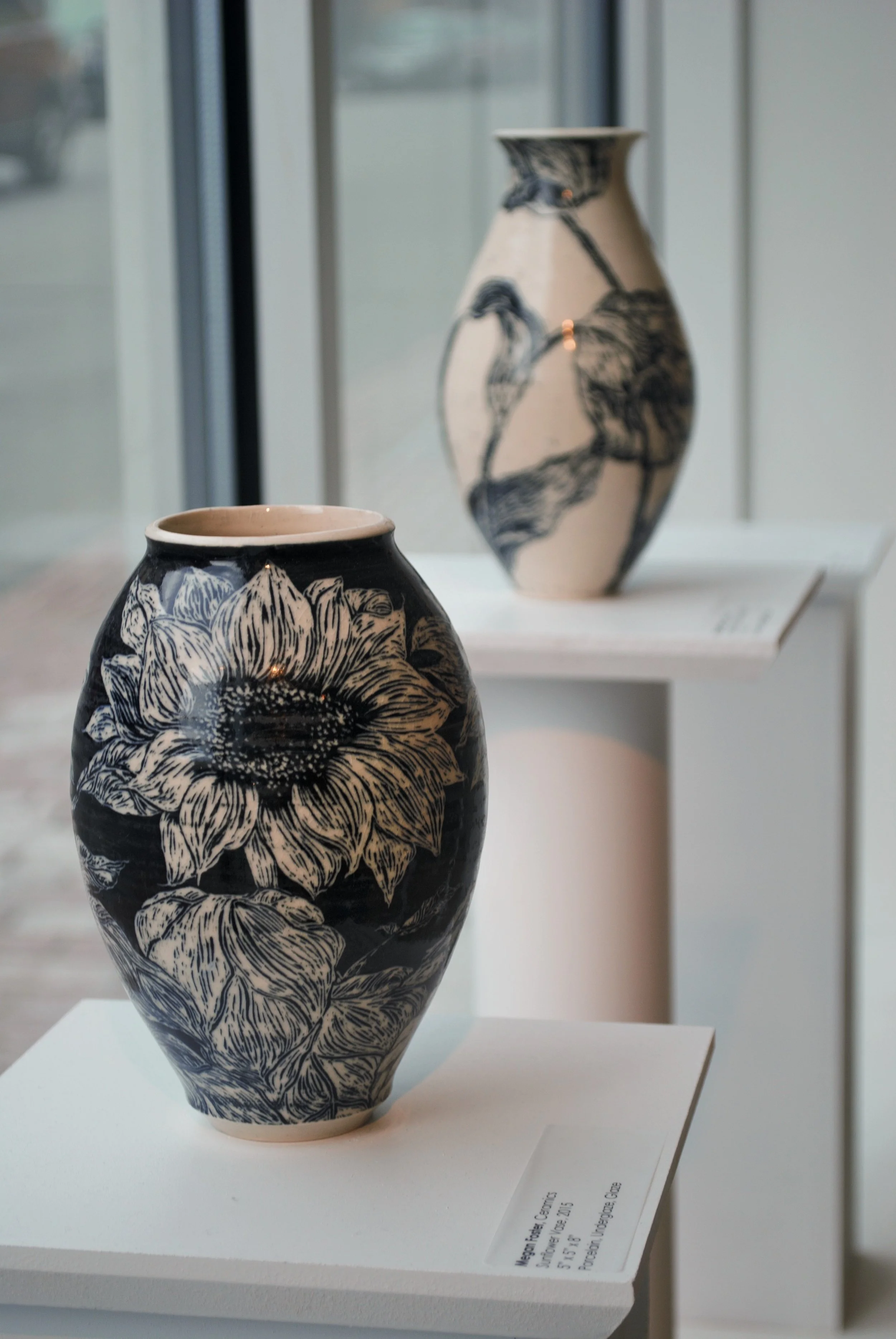 The forms of my work are alluring and elegant, with a beautiful surface that beckons, inciting the initial reaction. Many of my pieces are adorned with hand drawn flowers with a rich and direct sense of line. By allowing a flower’s contours and edges, its rhythm, to be the source of its beauty, I am able to draw people nearer to my work, revealing subtleties and encouraging discoveries. It begins the process of seeing, inviting people to slow down, as I have in making it, because, although we are surrounded by subtlety, it can often pass unnoticed (a misfortune of its discreet nature) without the seduction of beauty. By making striking work imbued with soft-spoken splendors, I create objects with the potential to stir interest in a second look.