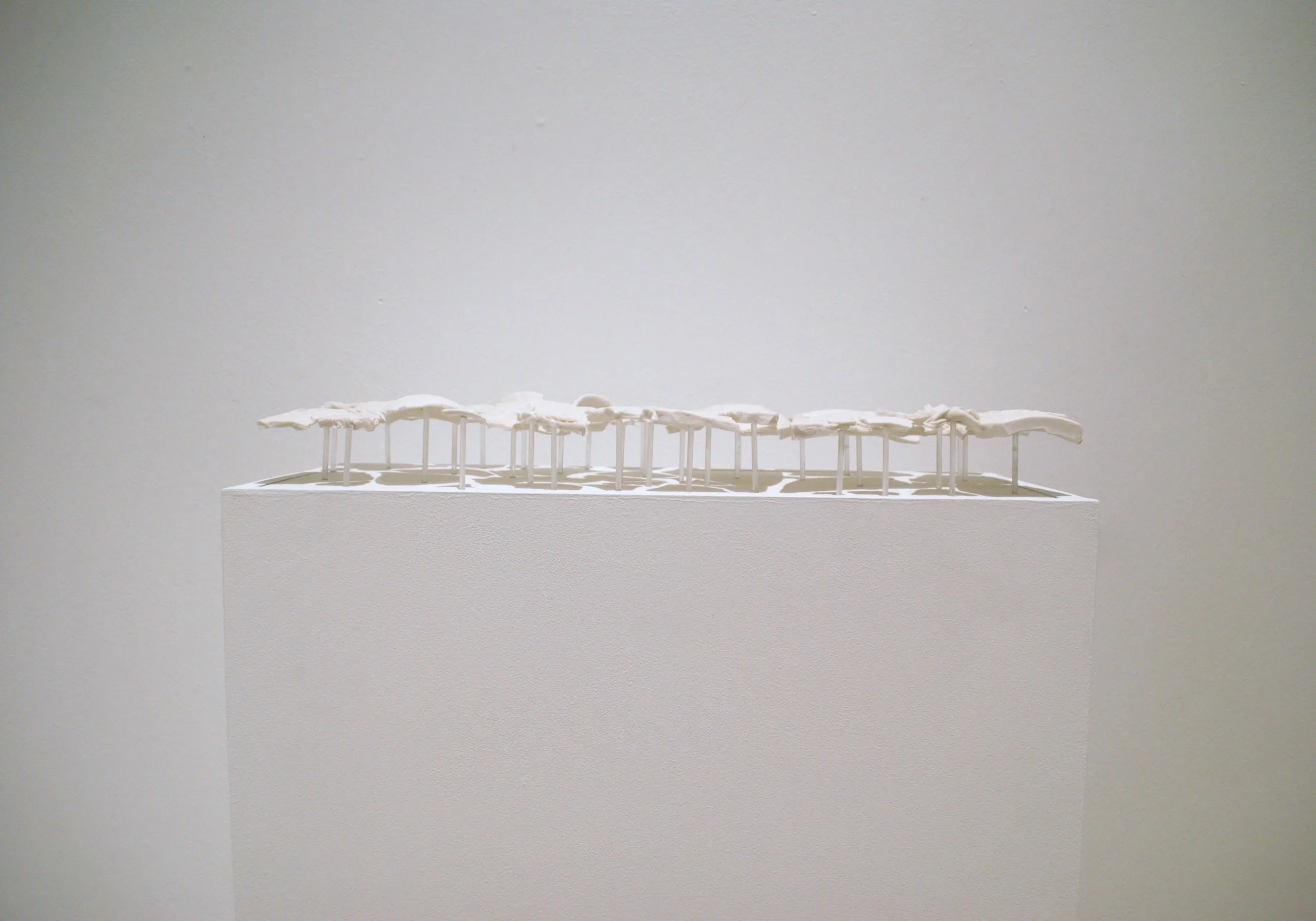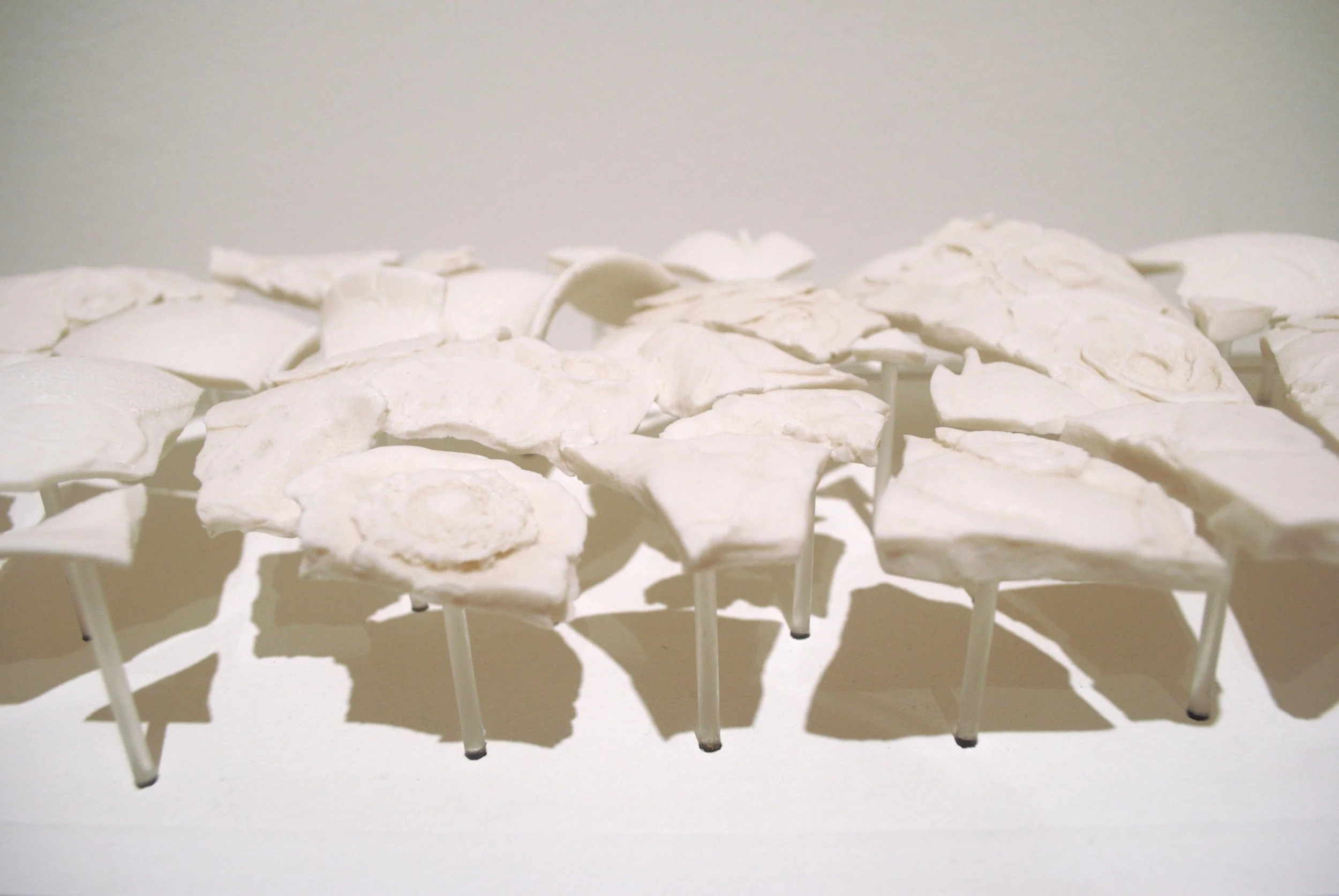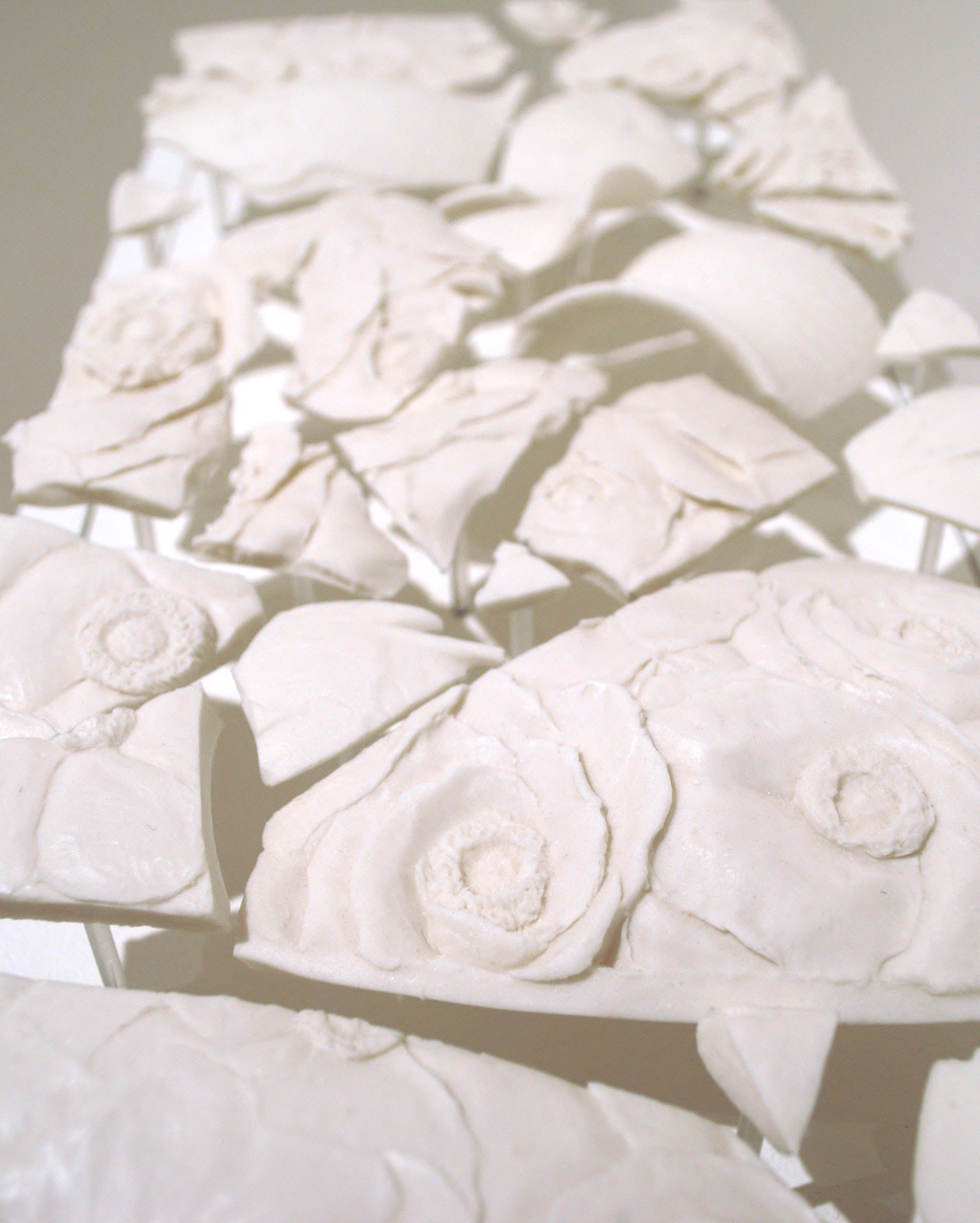 Materials Porcelain, relief carving, cone 6 electric, MDF, acrylic rod, adhesive, paint
